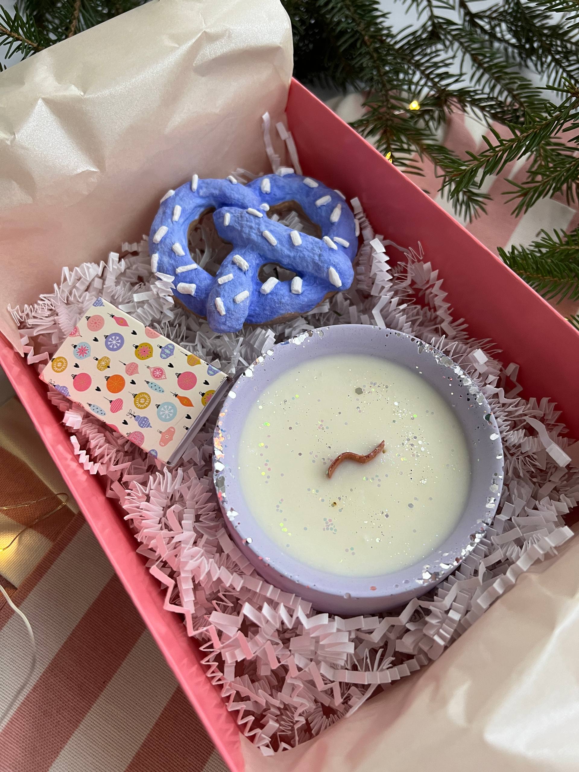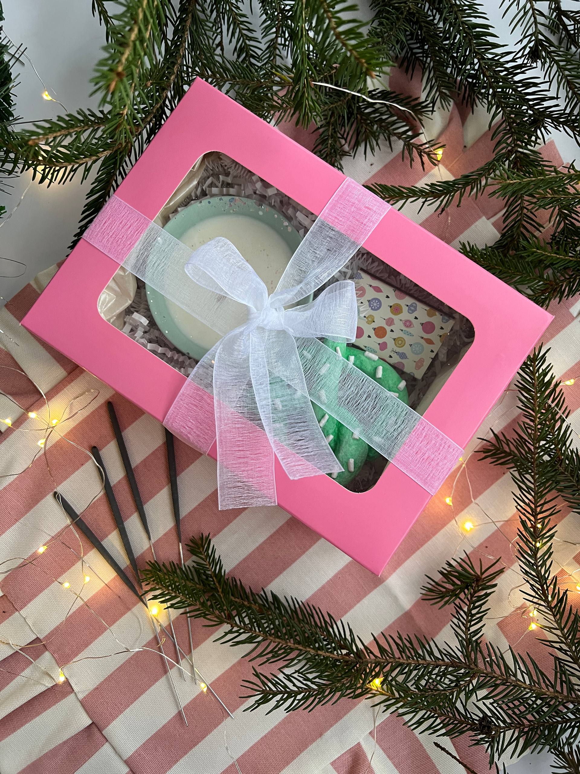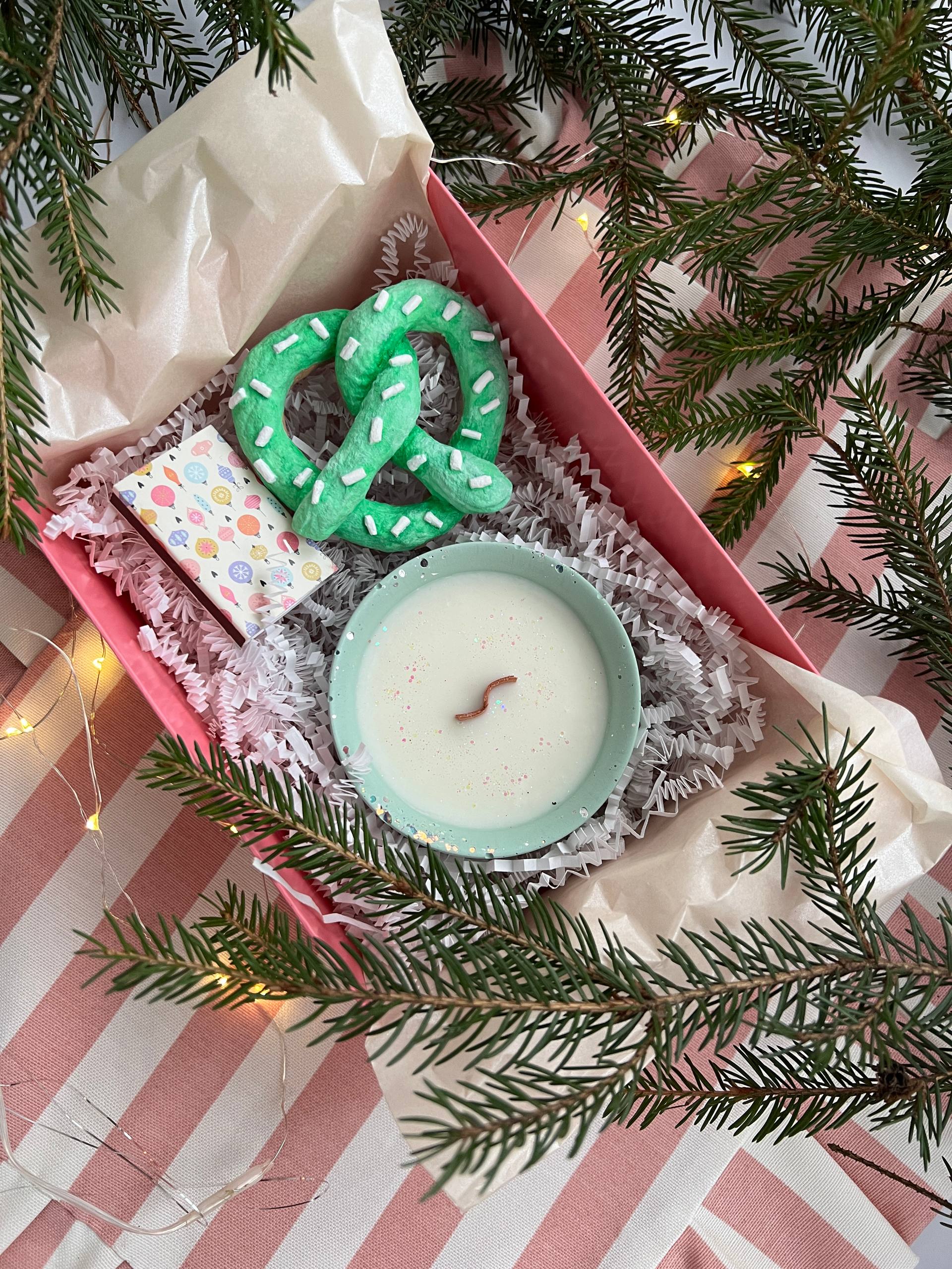 Внутри бокса находится вантная игрушка зеленый крендель + зеленая свеча с ароматом «Яблоко с корицей». Ноты: яблоко, специи, корица, слива кедр, мускус ( объём свечи 90мл, ~16 часов непрерывного горения)