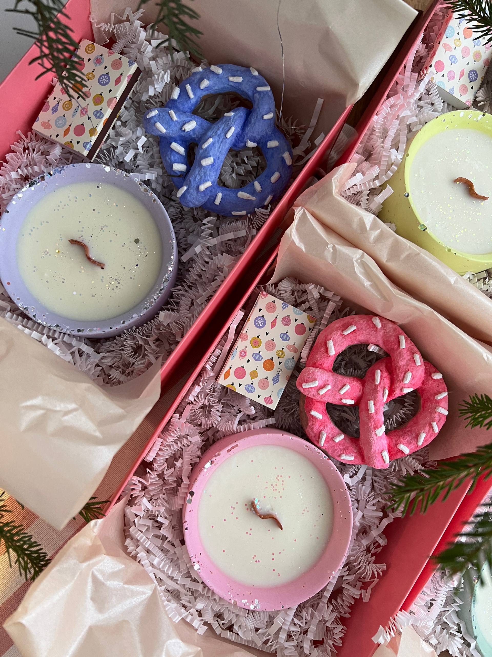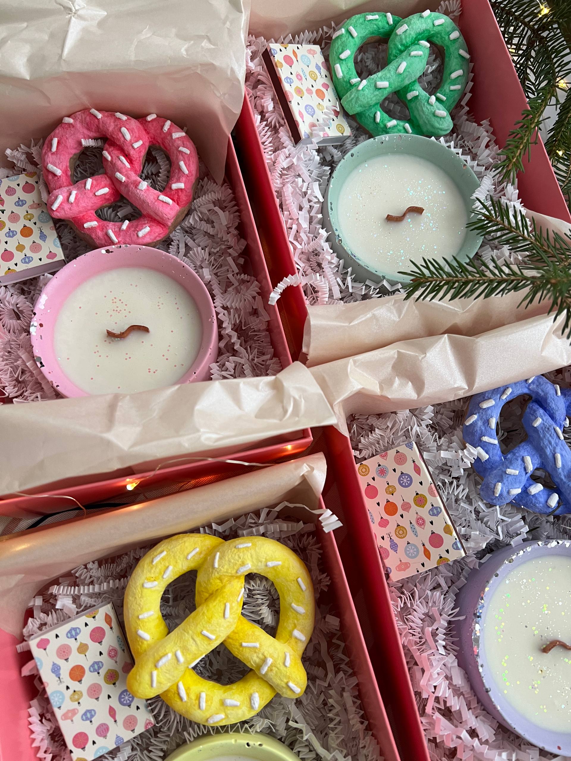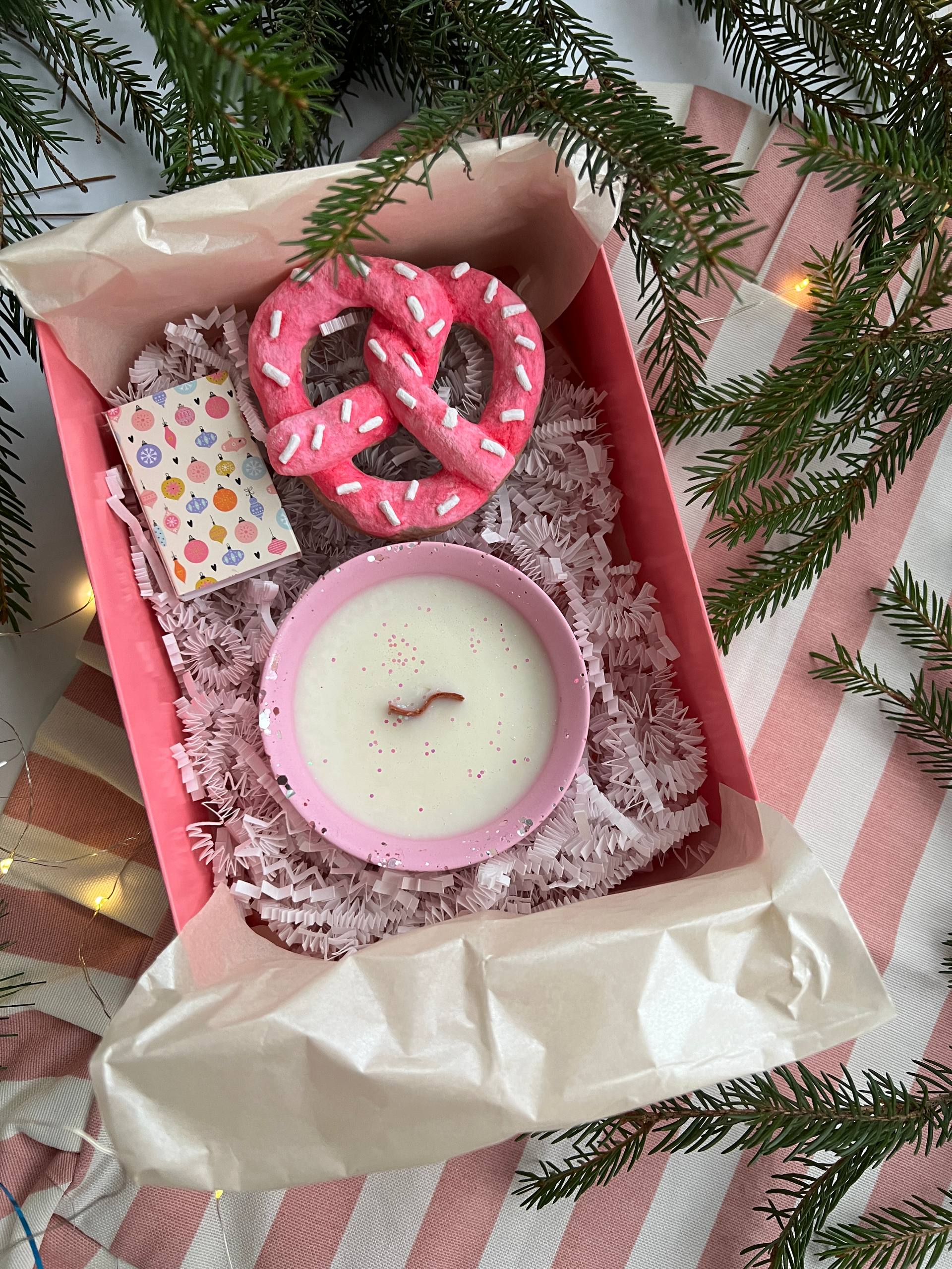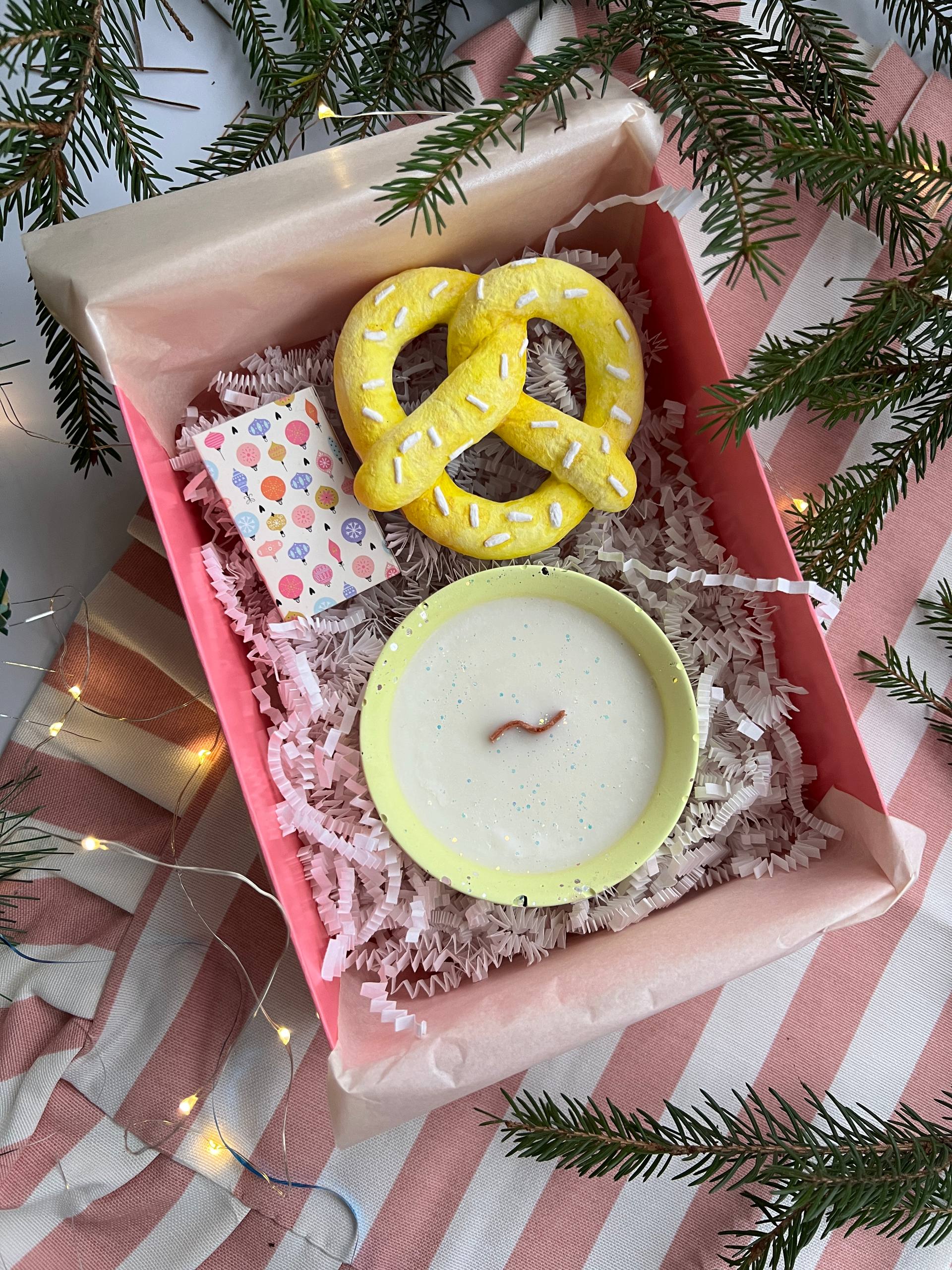 Внутри бокса находится вантная игрушка зеленый крендель + зеленая свеча с ароматом «Яблоко с корицей». Ноты: яблоко, специи, корица, слива кедр, мускус ( объём свечи 90мл, ~16 часов непрерывного горения)