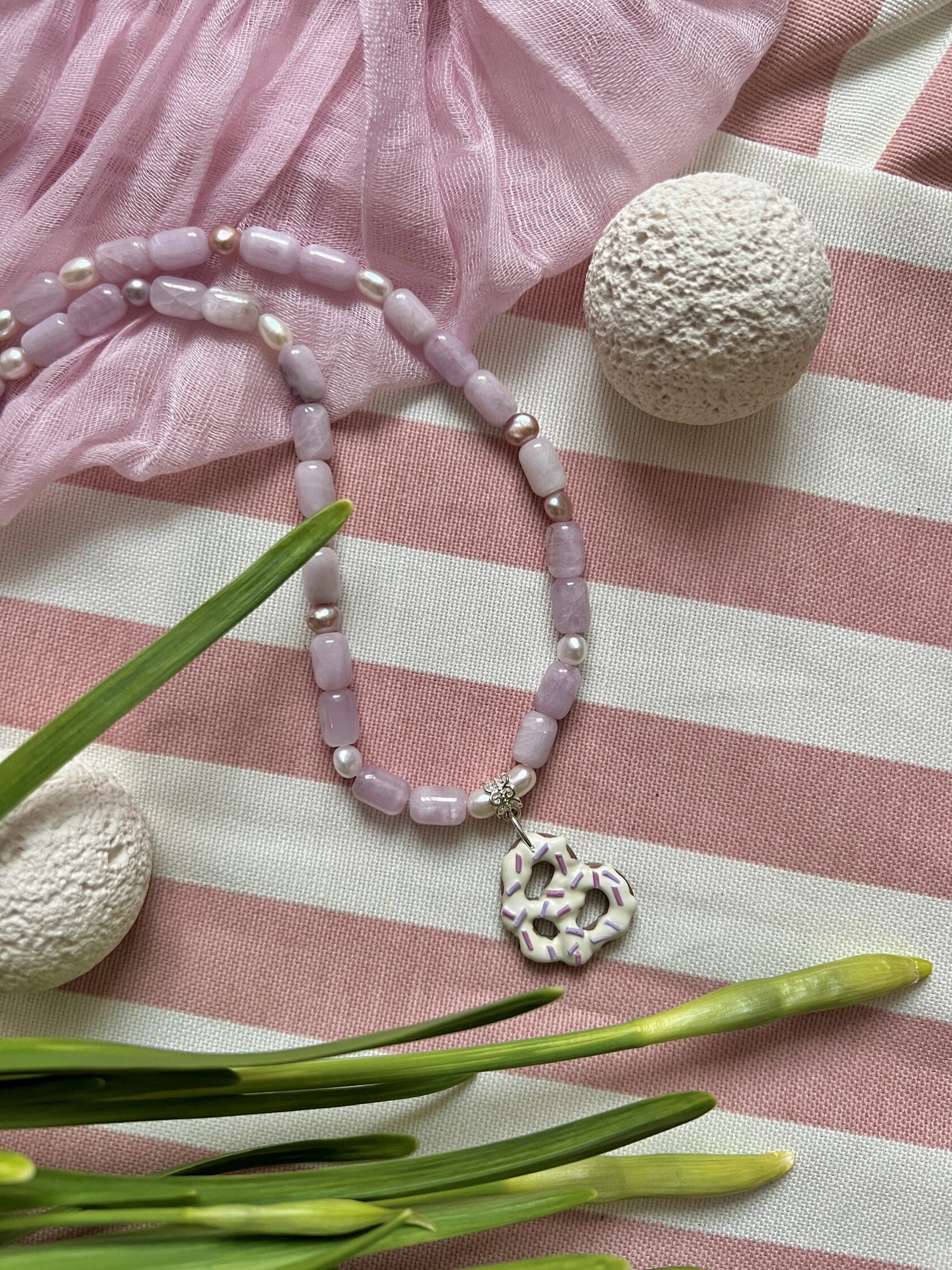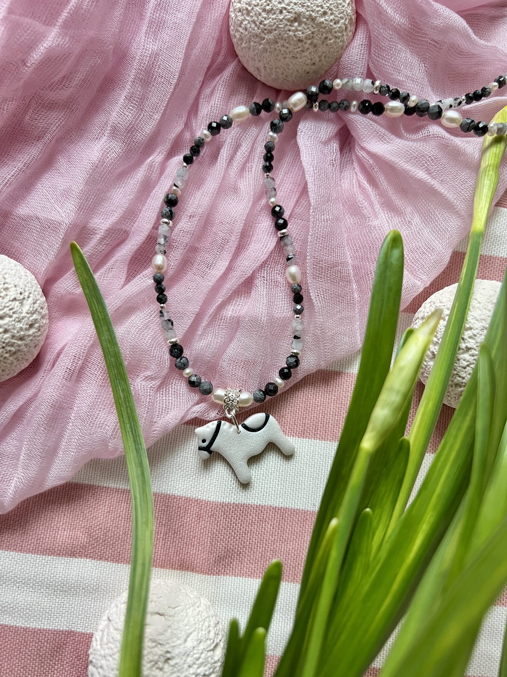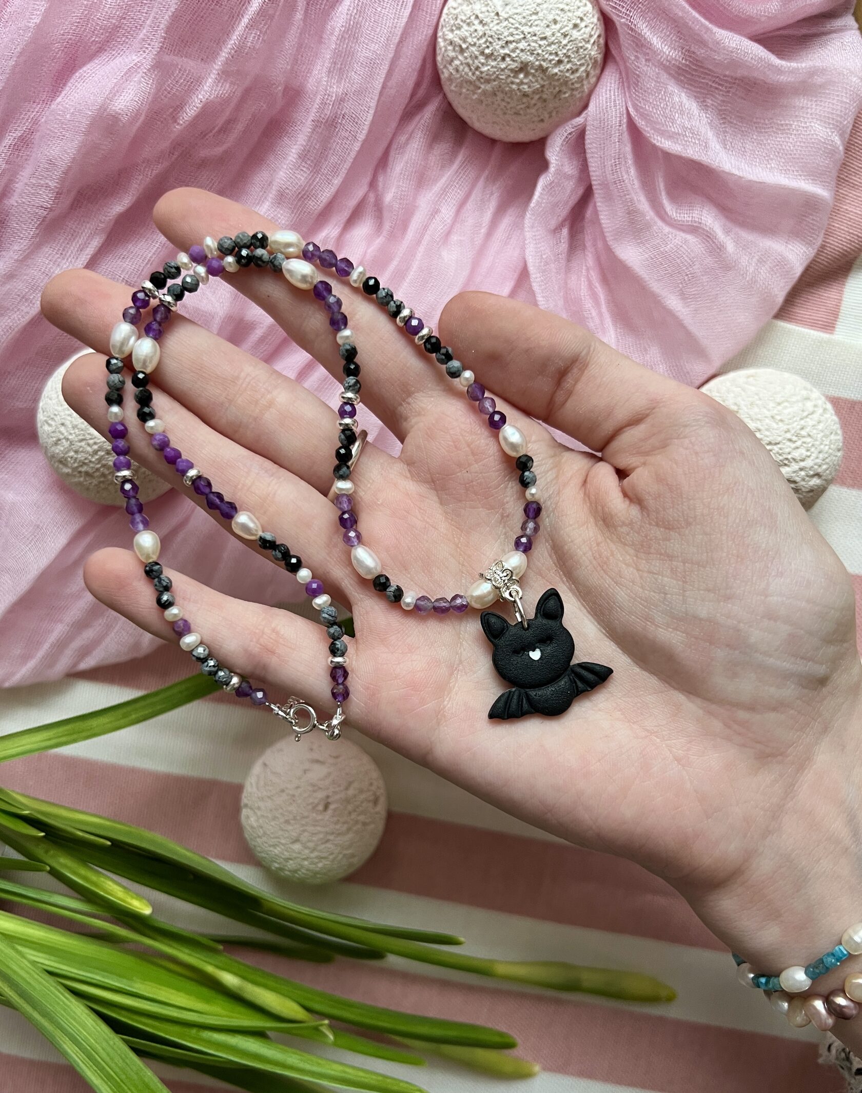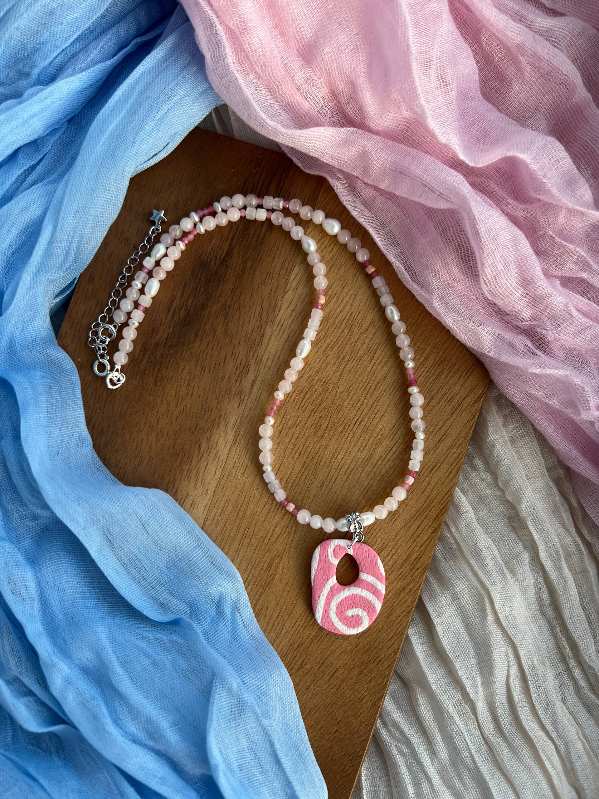 В изделии используются натуральные камни, жемчуг и серебряный замочек. Полимерная подвеска выполнена в ручную