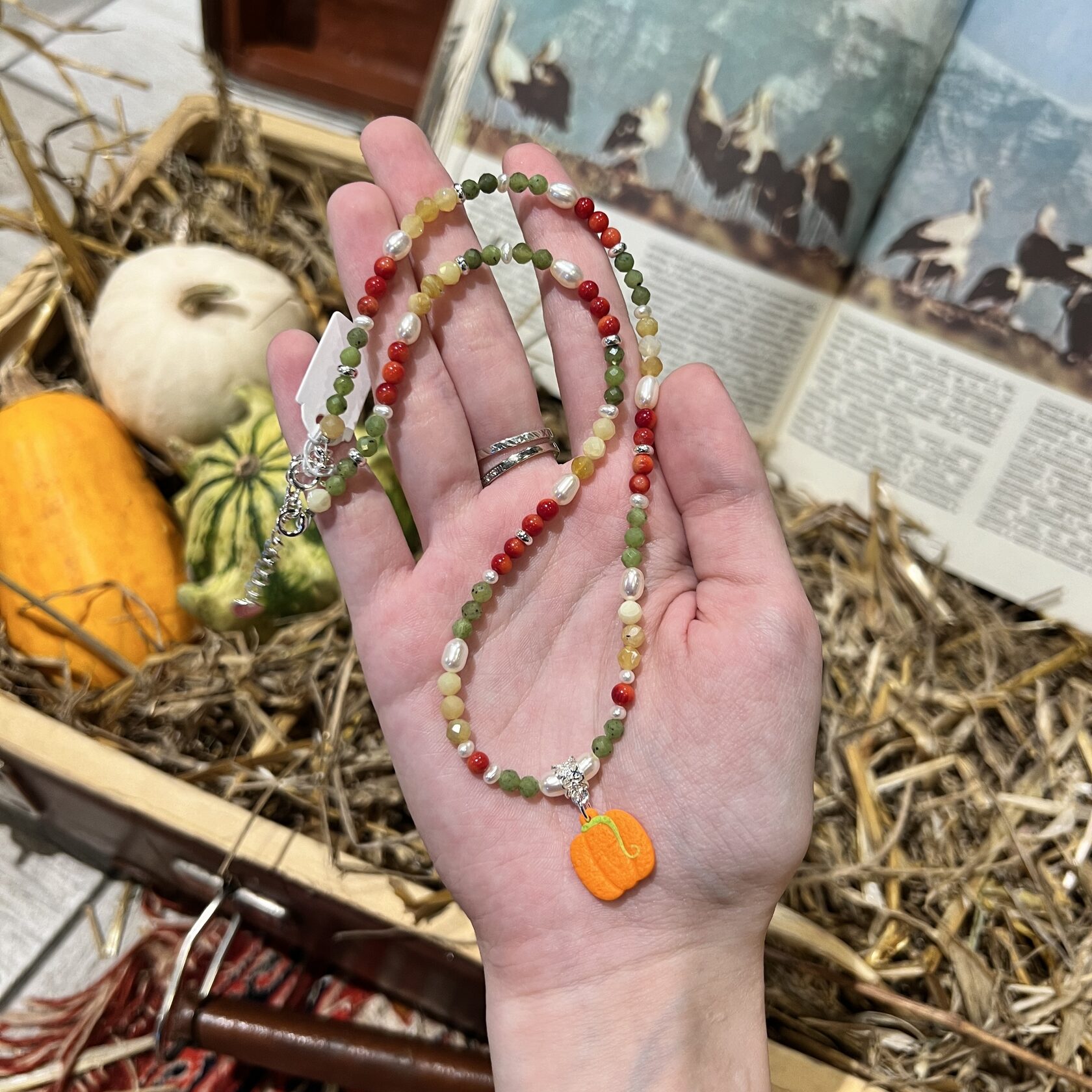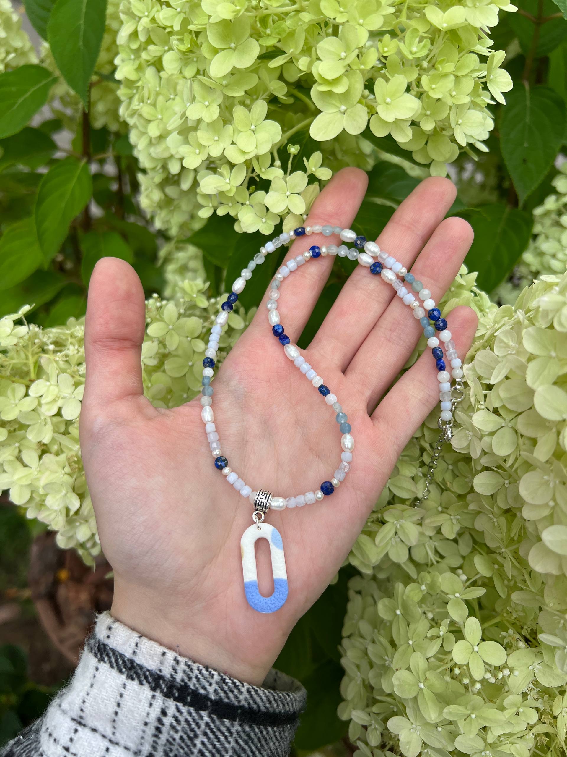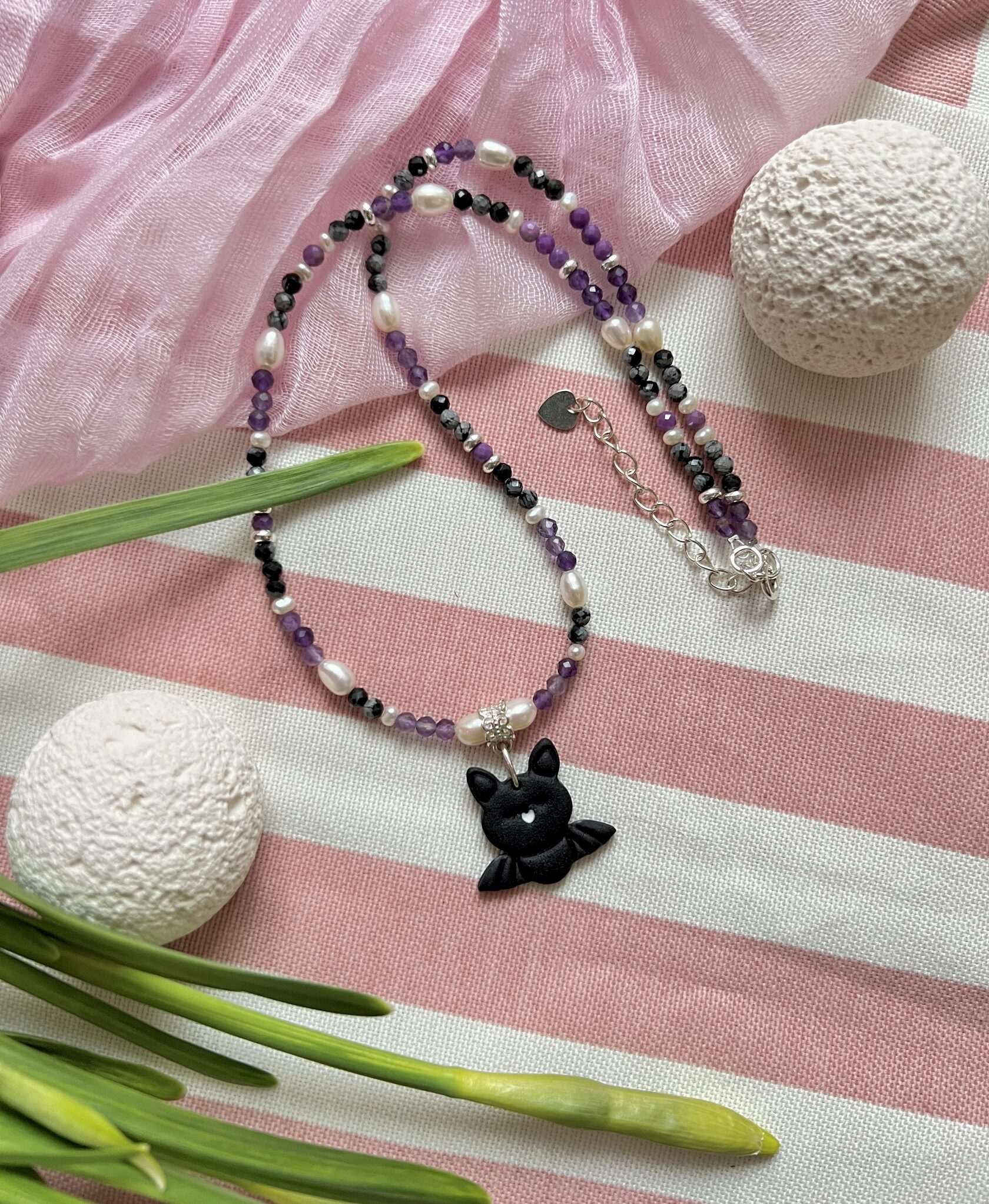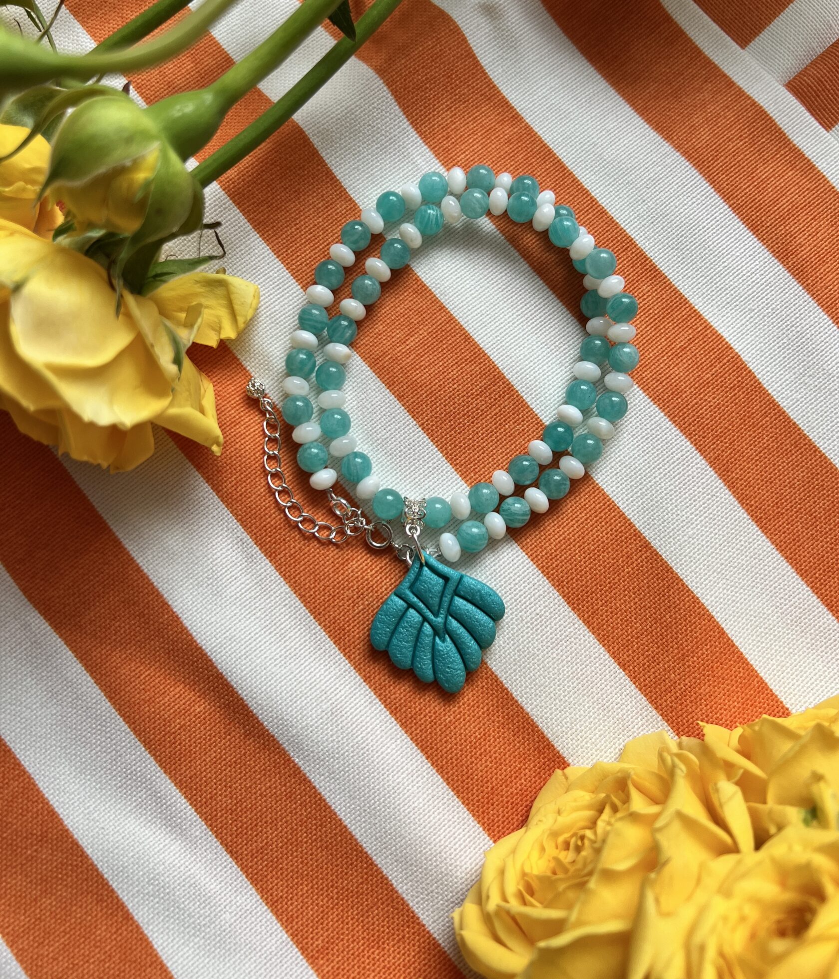 В изделии используются натуральные камни, жемчуг и серебряный замочек. Полимерная подвеска выполнена в ручную