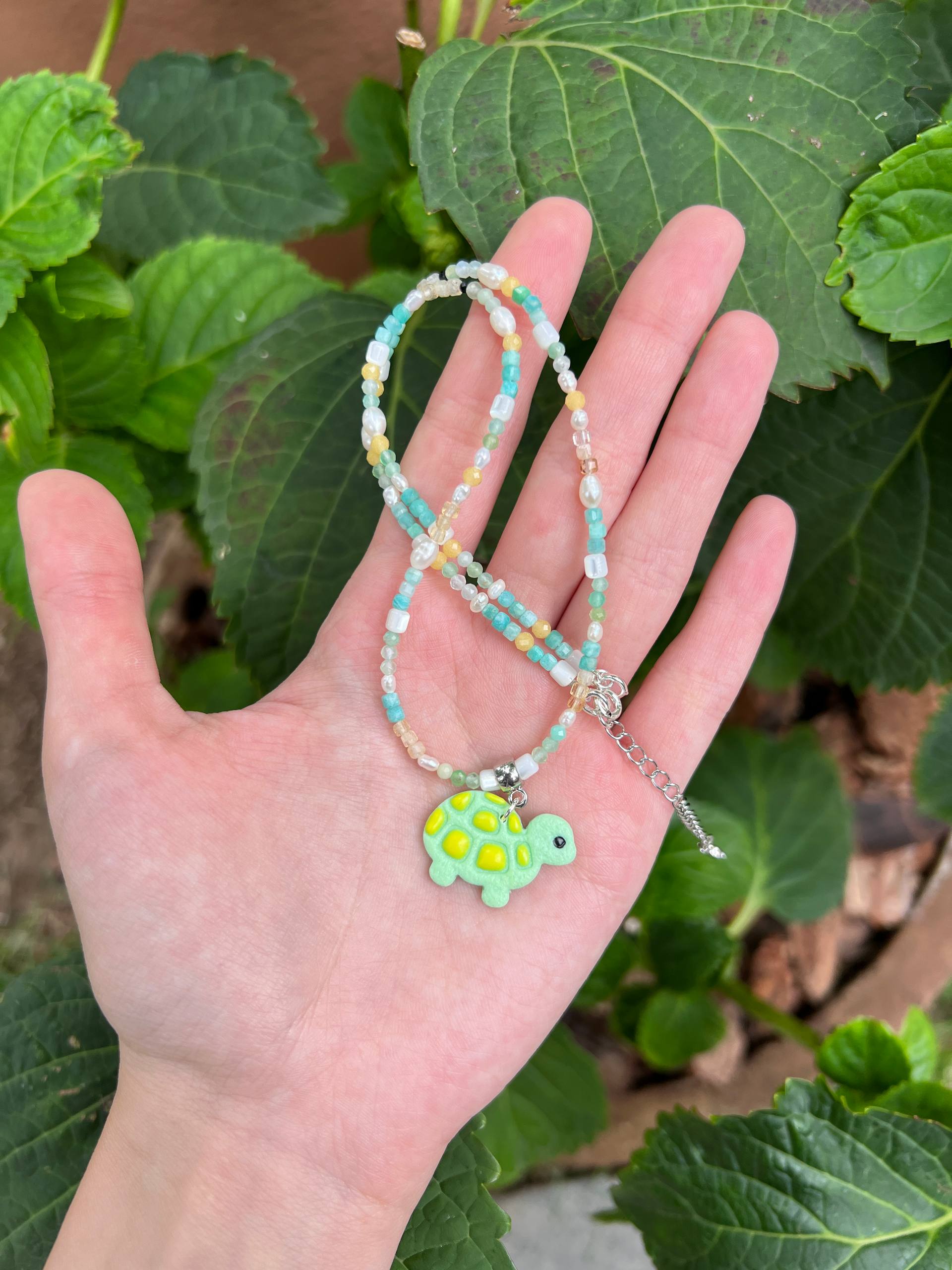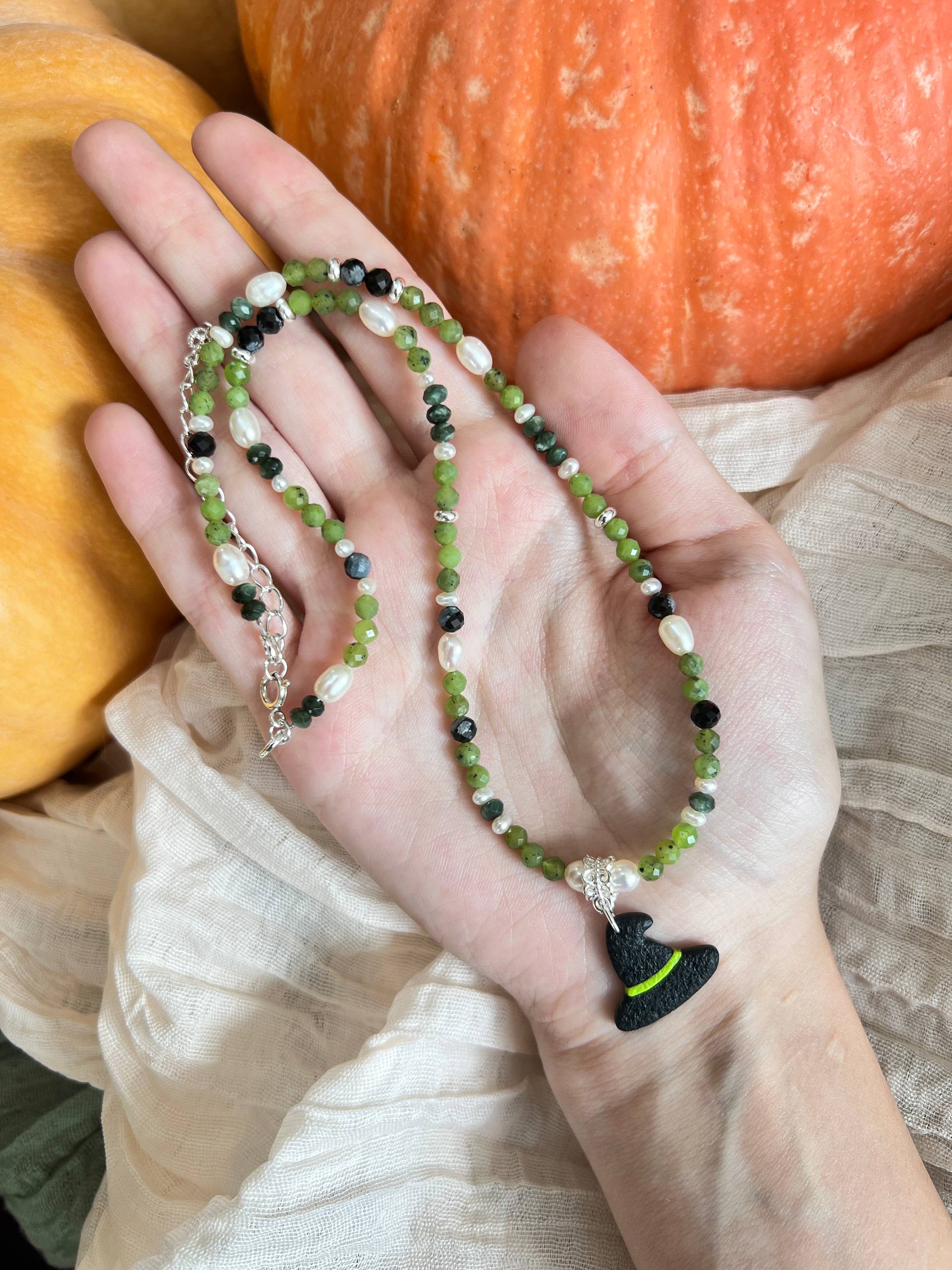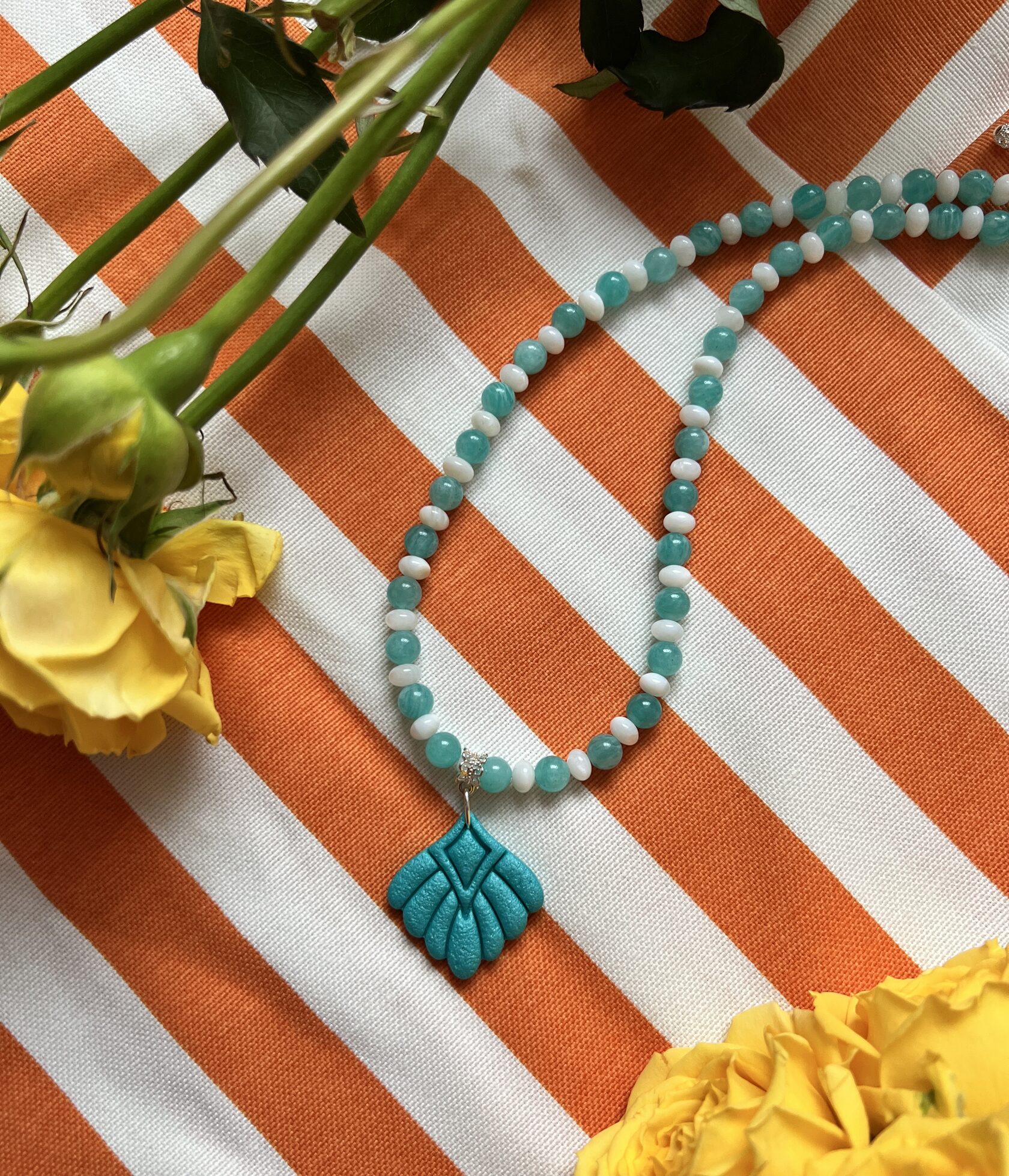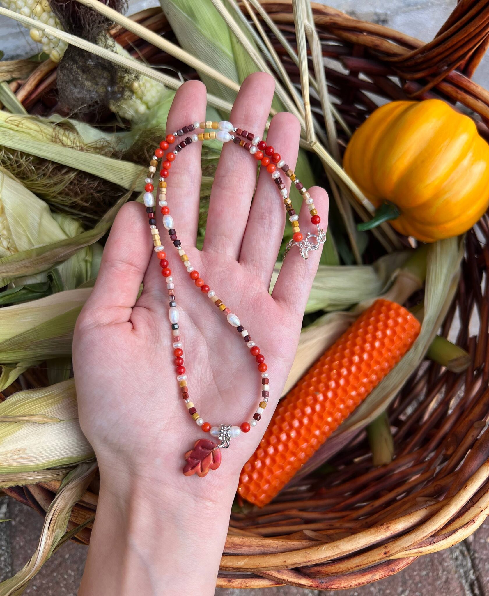 В изделии используются натуральные камни, жемчуг и серебряный замочек. Полимерная подвеска выполнена в ручную
