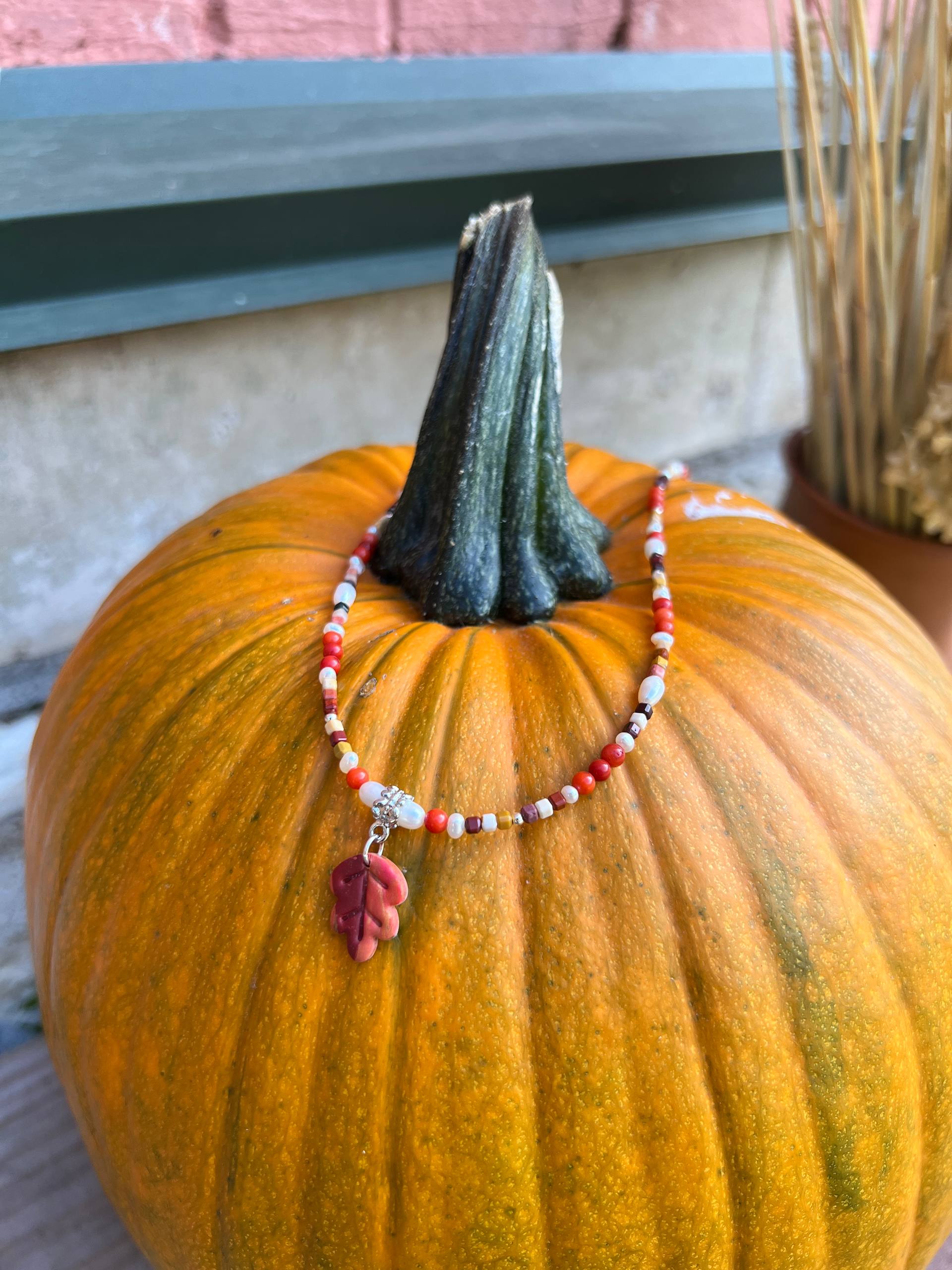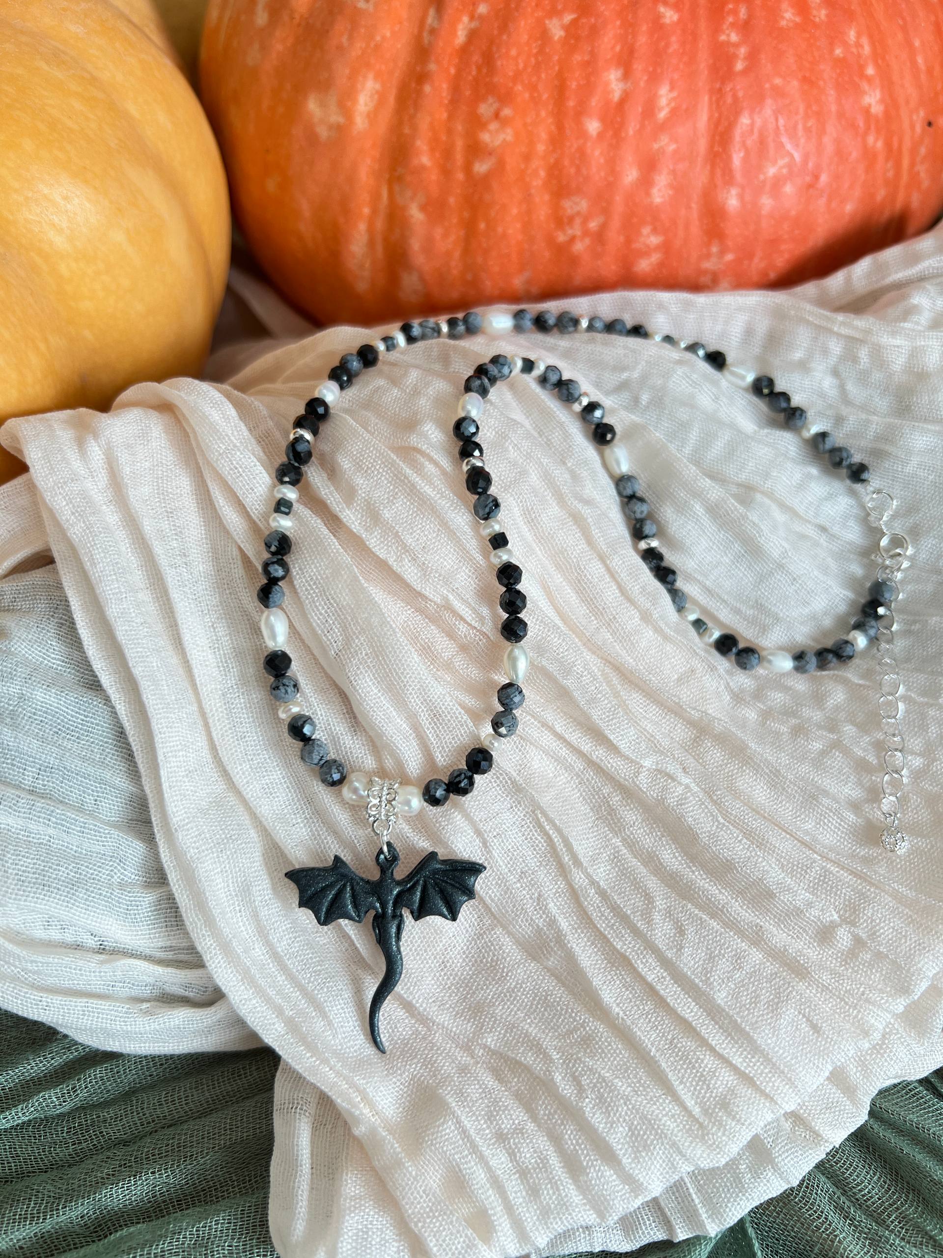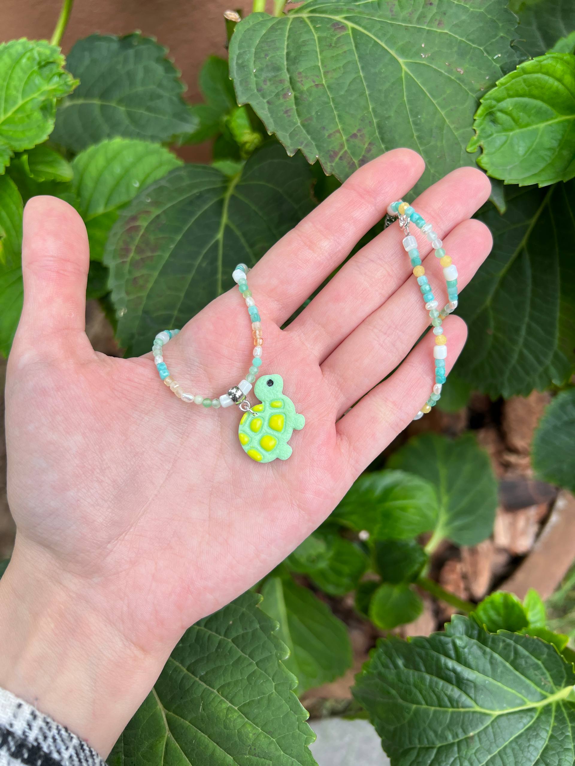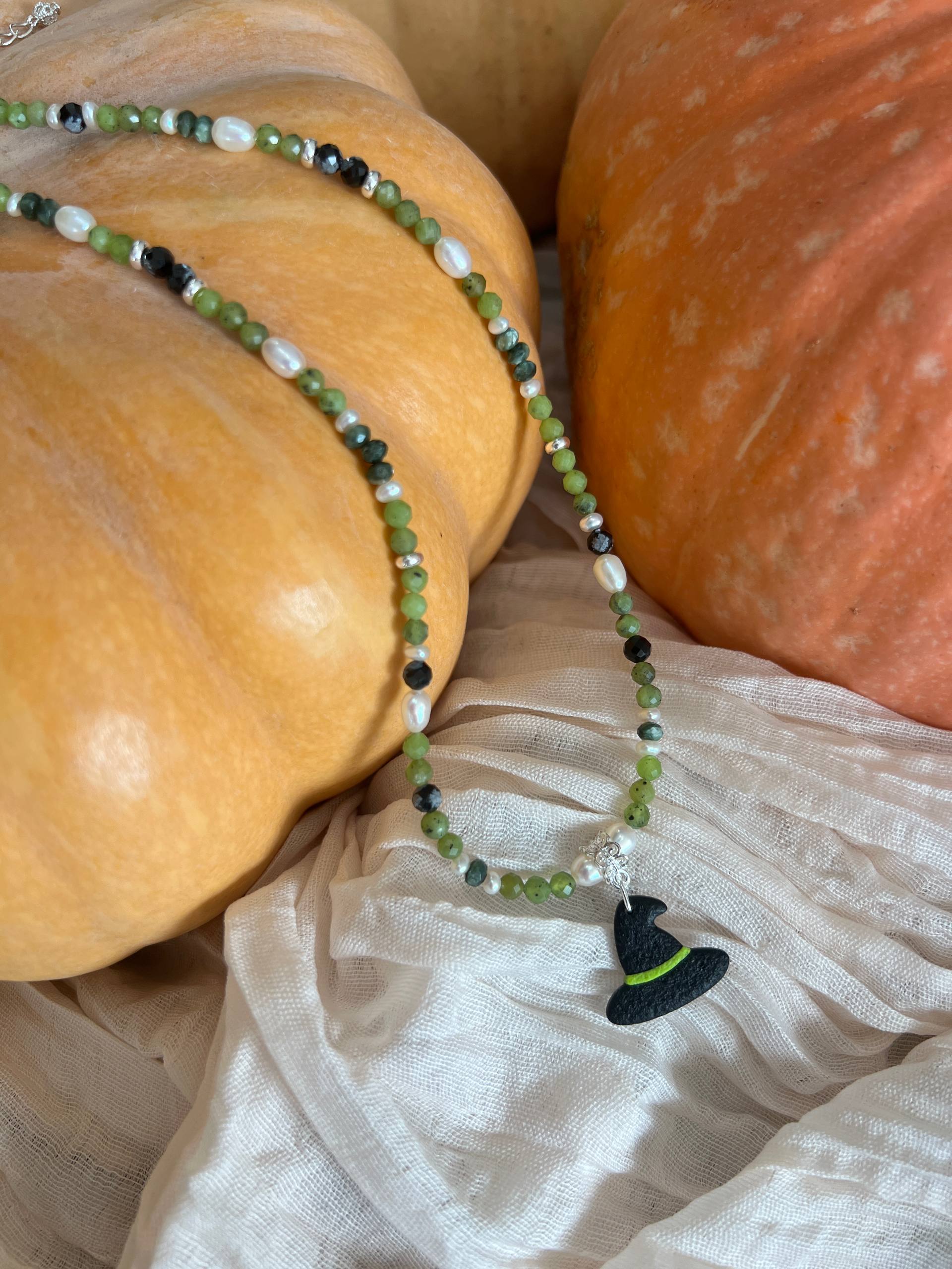 В изделии используются натуральные камни, жемчуг и серебряный замочек. Полимерная подвеска выполнена в ручную